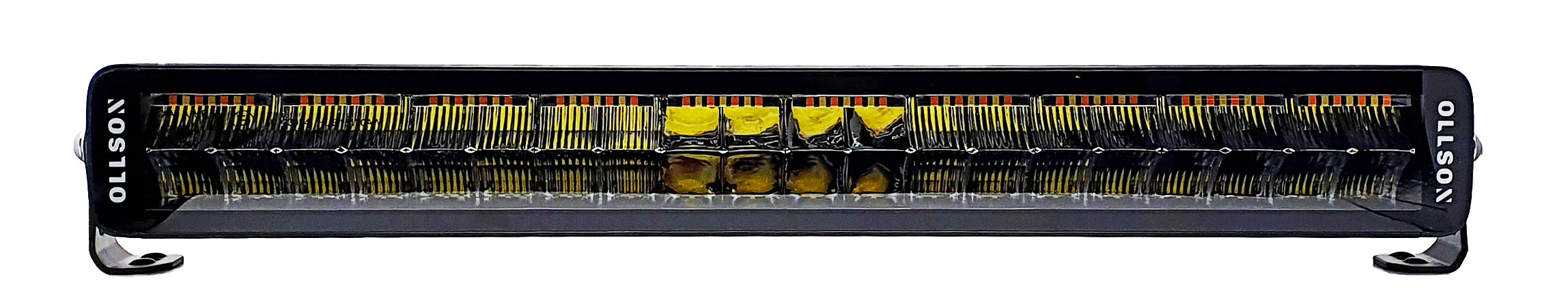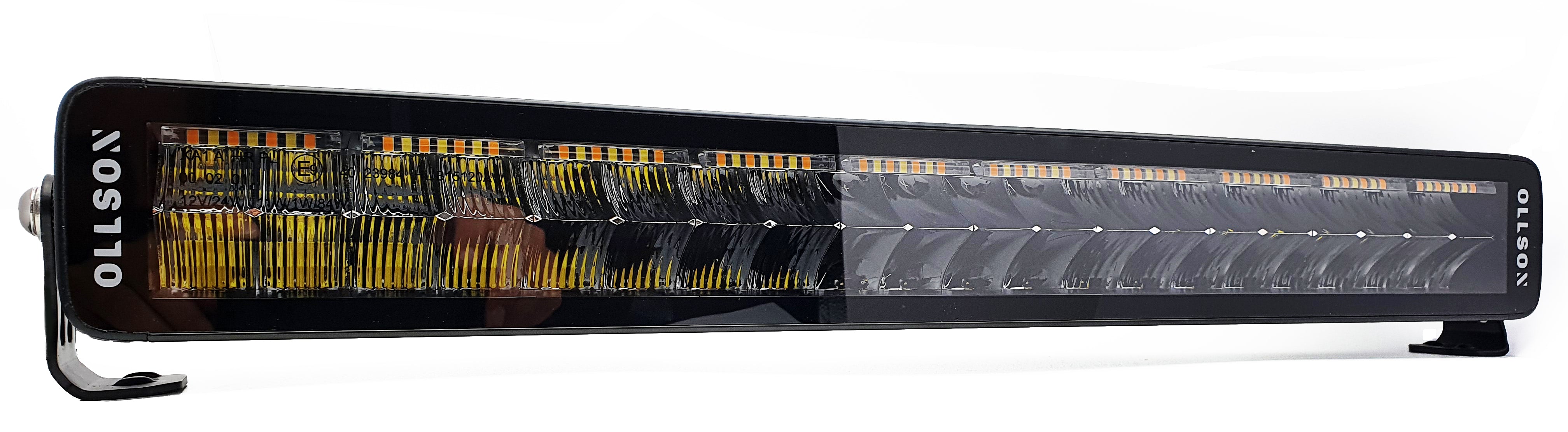 De 21,5"/ 55cm, Ollson 220 Double row Multi-bar is de laatste ontwikkeling! uitgerust met ECE R65 goedgekeurde oranje flitsfunctie. R7 goedgekeurde witte stadslichten en oranje stadslichten. R112 goedgekeurd grootlicht functie.